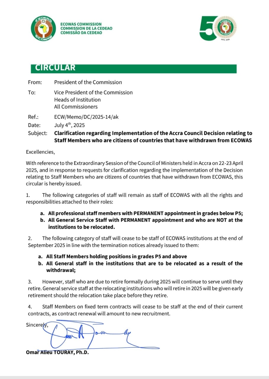 Rather than prioritising the wider interests of ordinary ECOWAS citizens, the President of the Commission has been preoccupied with protecting narrow, self‑serving agendas. In direct contravention of the clear provisions of the Revised Treaty and the ECOWAS Staff Regulations, the President issued the below controversial memo that not only disregarded institutional norms but also displayed open hostility toward the ECOWAS Community itself by seeking to permanently retain staff members from the exited states in the ECOWAS.